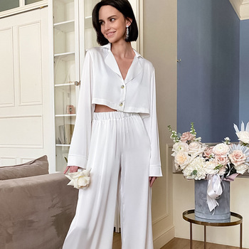 Gran oferta, ropa de casa, pijamas suaves de manga larga de satén, Top corto con cuello vuelto, pantalones sueltos, conjuntos de ropa de dormir blanca para mujer